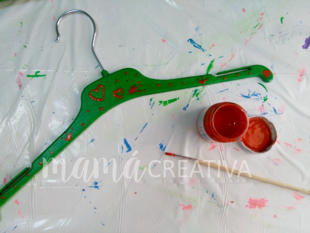Dejamos secar y empezamos a decorar como nos guste, en nuestro caso, con un bastoncillo hicimos lunares de otro color en unas perchas, y en la otra con un pincel dibujamos unos corazones.