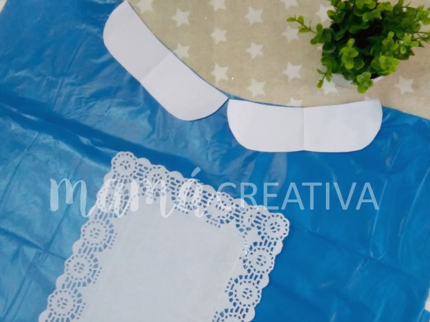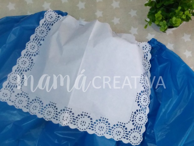 Por ejemplo, si con este mismo color azul, en vez de poner las tulipas blancas, lo decoramos con copos de nieve de goma eva plateada de purpurina, nos quedará un disfraz de Elsa de Frozen precioso.