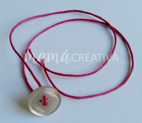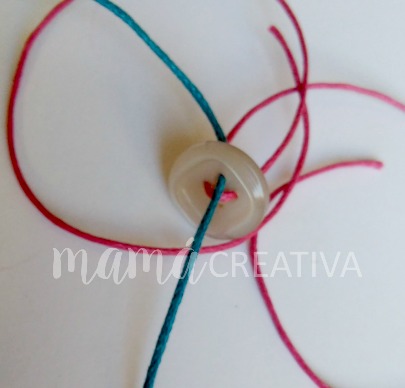 Insertamos el primer cordón por un agujero del botón y luego por el otro que está en diagonal al primero.