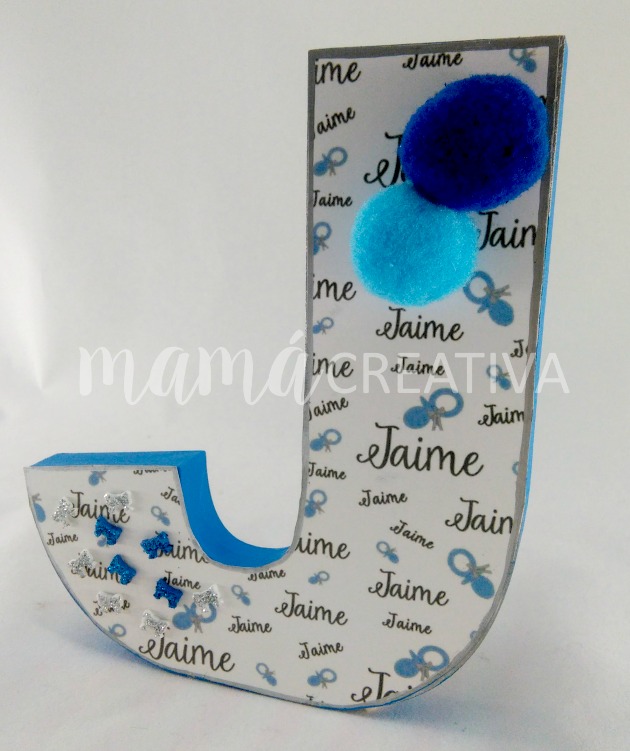 En este caso la letra está pintada de azul, y decorada con el nombre de Jaime y unos chupetes, es para un regalo a un recién nacido.
